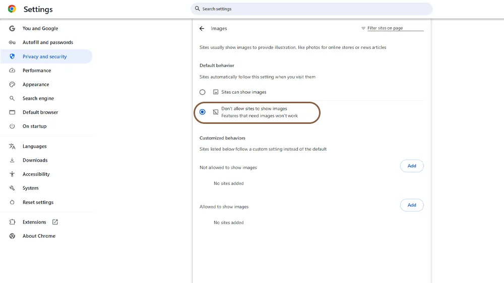 برای جلوگیری از هدررفتِ پهنای باند، نمایش تصاویر را کاملاً متوقف کنید. در نوار آدرس عبارت chrome://settings/content/images را وارد کرده و گزینه Don’t allow sites to show images را انتخاب کنید. با این کار، صفحات خبری تنها با بارگذاری متن باز می‌شوند.