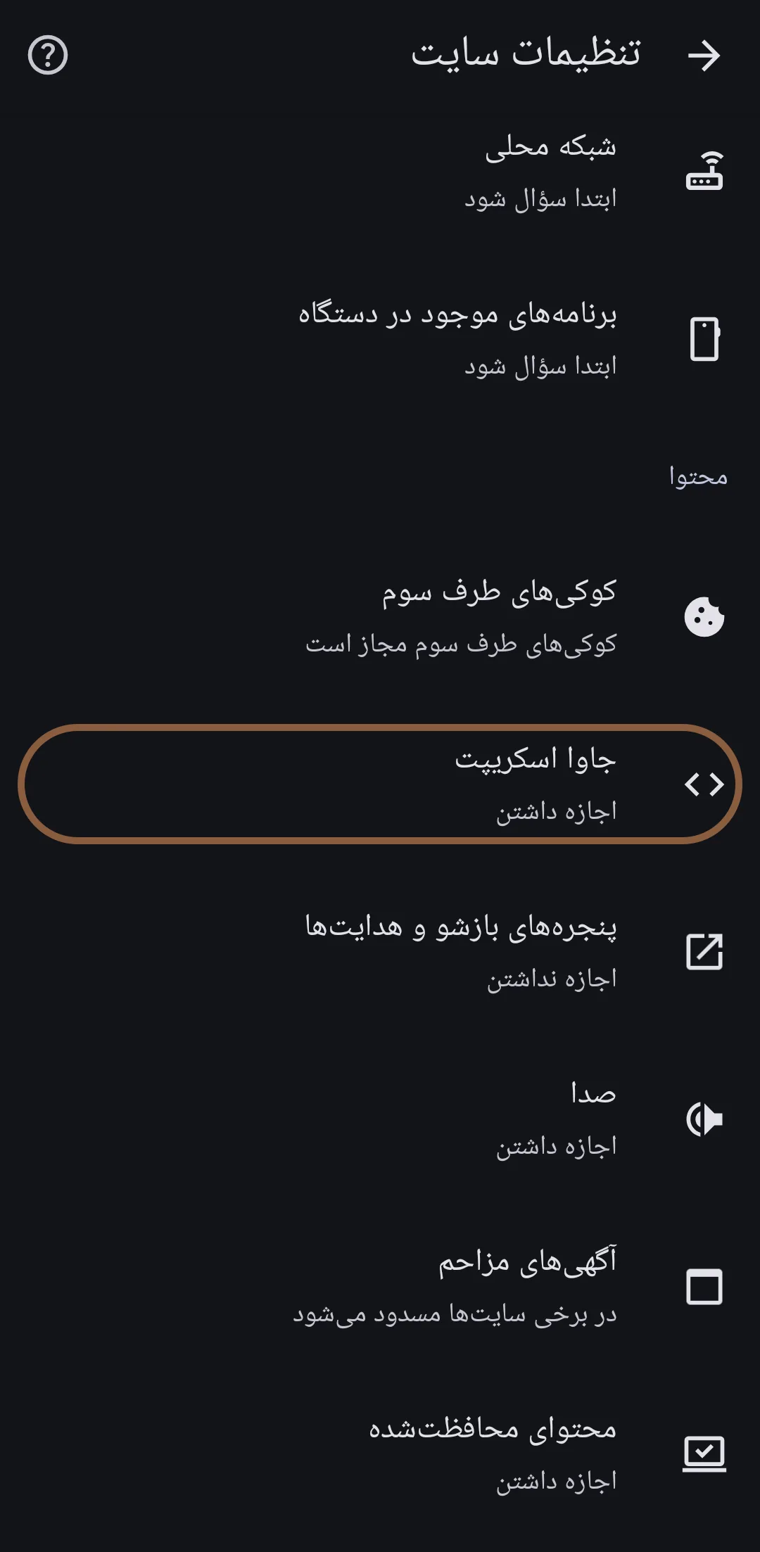 • گزینه جاوا اسکریپت (JavaScript) را پیدا کرده و روی آن ضربه بزنید.