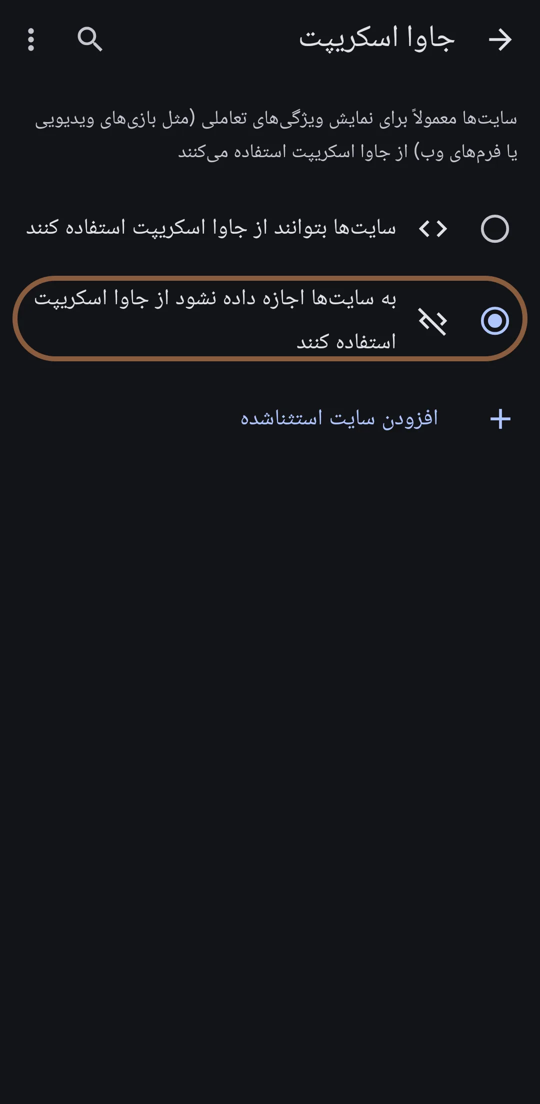 اجرای JavaScript سایت را غیرفعال می‌کند. این گزینه می‌تواند مصرف منابع و بار اضافی صفحه را کم کند، اما ممکن است بعضی سایت‌ها را ناقص یا کاملاً از کار بیندازد.