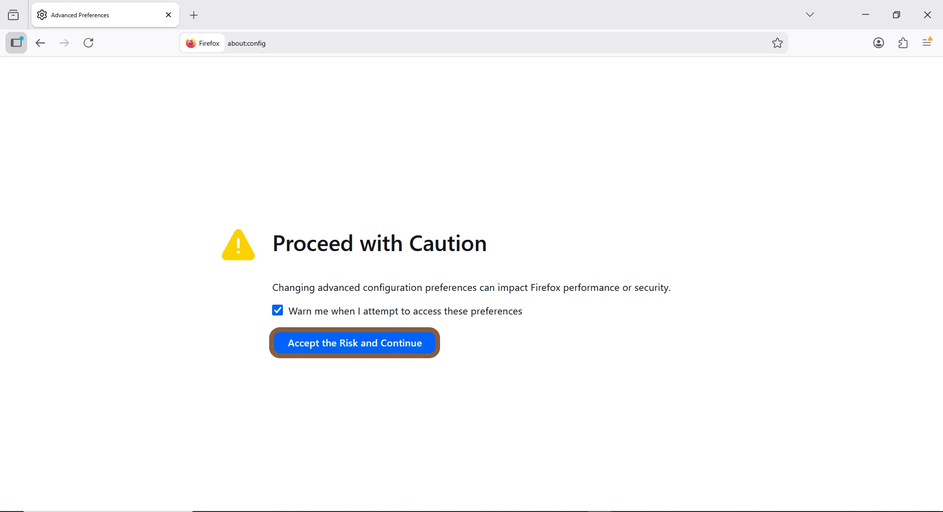 1. در نوار آدرس بالای صفحه، عبارت about:config را تایپ کنید و اینتر بزنید؛