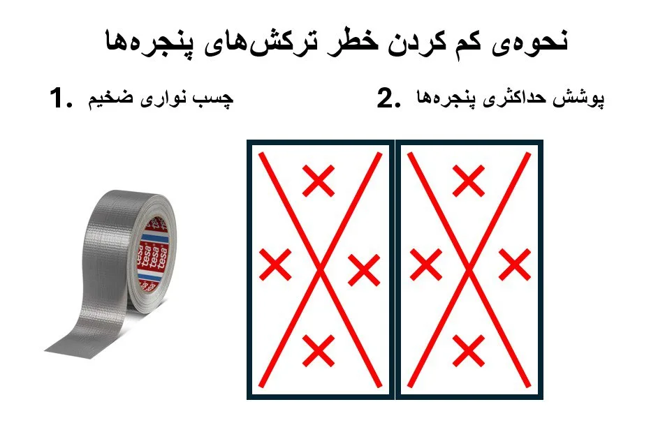 ✅ روکشهای پلاستیکی یا چسب پهن برای پوشاندن پنجرهها تهیه کنید تا از پاشیدن خردهشیشه جلوگیری شود.