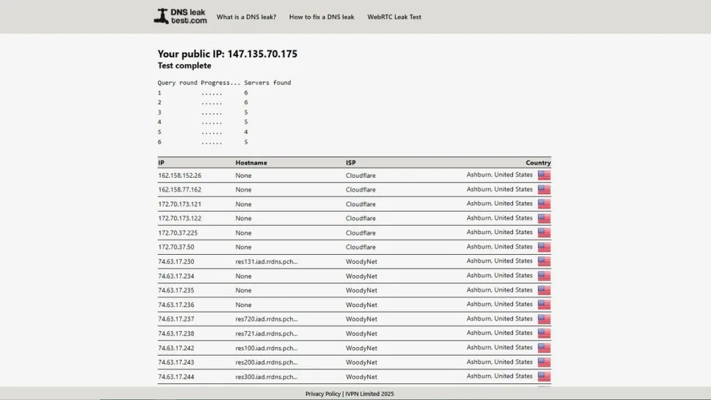 تحلیل نتایج بسیار ساده است: در این جدول، شما فقط باید مشخصات سرورهای VPN خودتان را ببینید. اگر در لیست نهایی، نام اپراتور یا کشوری را مشاهده کردید که با لوکیشنِ انتخابی در VPN هماهنگ نیست، یعنی با نشت DNS روبرو شدهاید. در واقع، وجود هر ردیفِ ناشناسی در این لیست نشان میدهد که بخشی از اطلاعات شما از مسیر امن خارج شده و هویت واقعی یا فعالیتهایتان برای اشخاص ثالث قابل ردیابیست.