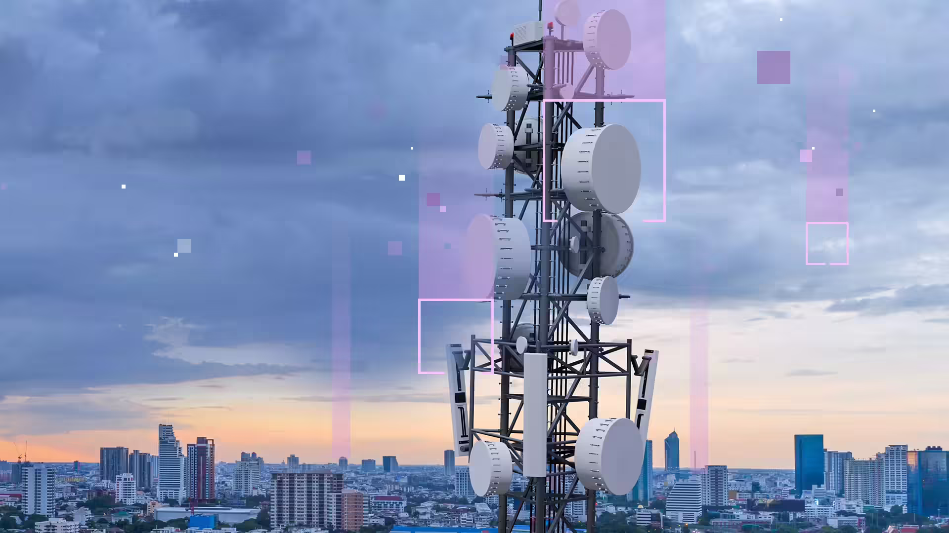 تصویری از یک دکل مخابراتی با پس‌زمینه افق یک شهر و مربع‌های صورتی‌رنگ که نماد از گلیچ کردن شبکه هستند.