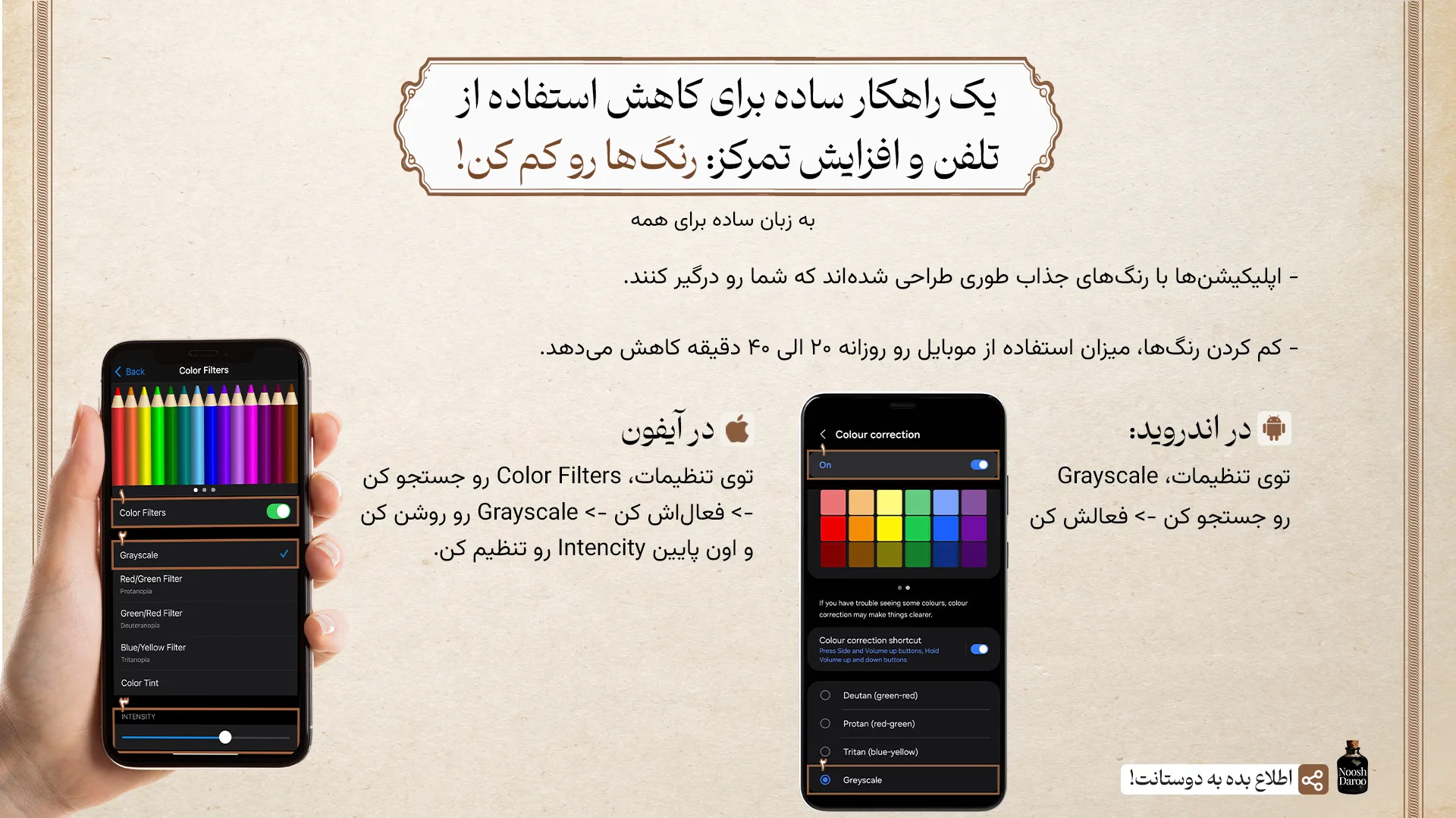 رنگهای جذاب در اپلیکیشنها بهگونهای طراحی شدهاند که توجه شما را جلب کرده و موجب درگیری بیشتر با تلفن همراه شوند. یکی از روشهای مؤثر برای کاهش این درگیری، کاهش شدت رنگها یا فعالسازی حالت سیاهوسفید (Grayscale) در تلفن همراه است.