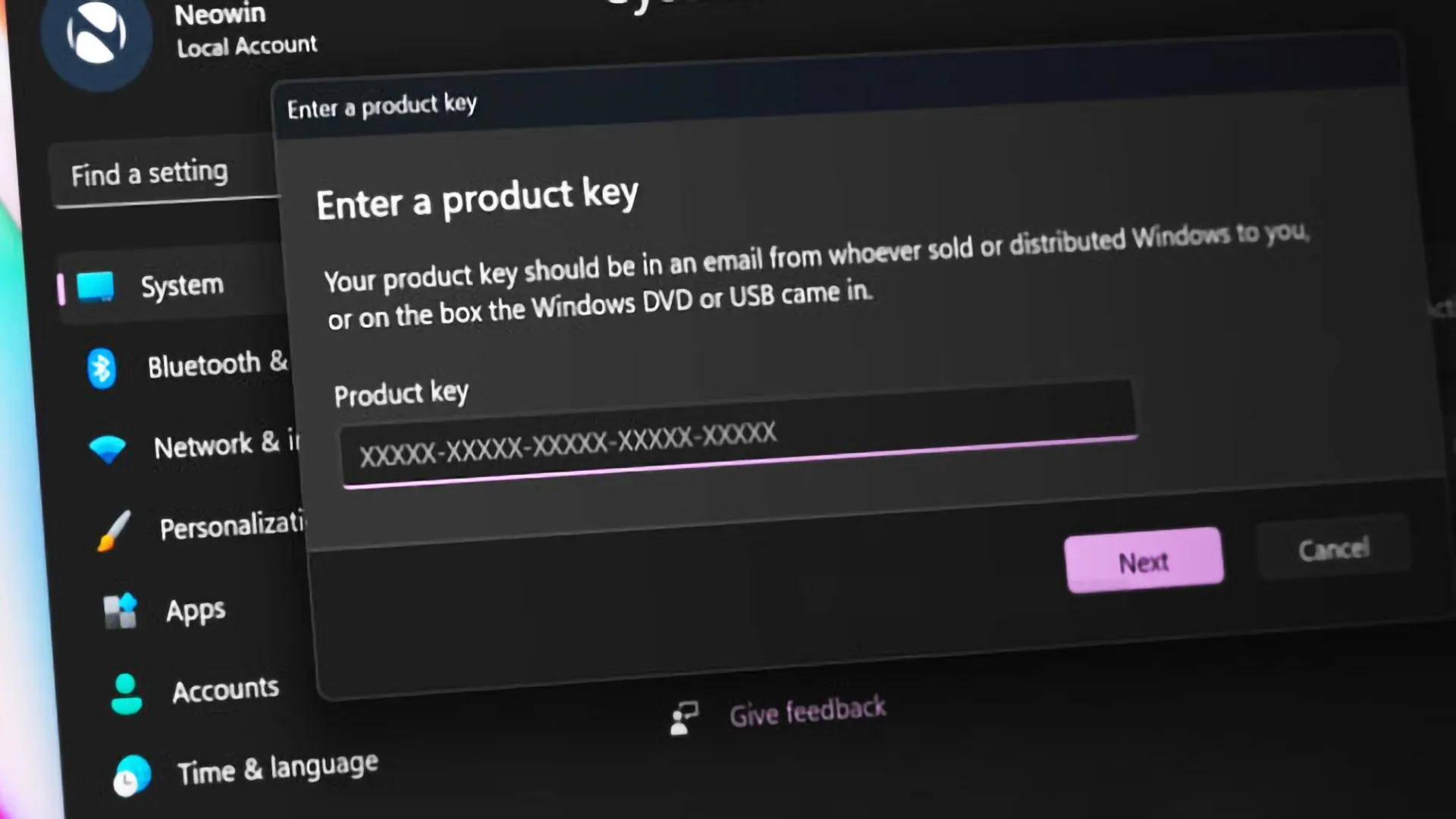 صفحه فعال‌سازی ویندوز ۱۱ را نشان می‌دهد که از کاربر می‌خواهد Product Key وارد کند. چنین صفحه‌ای معمولاً زمانی ظاهر می‌شود که ویندوز هنوز فعال نشده یا برای ادامه فعال‌سازی به اتصال اینترنت و تأیید لایسنس نیاز دارد.