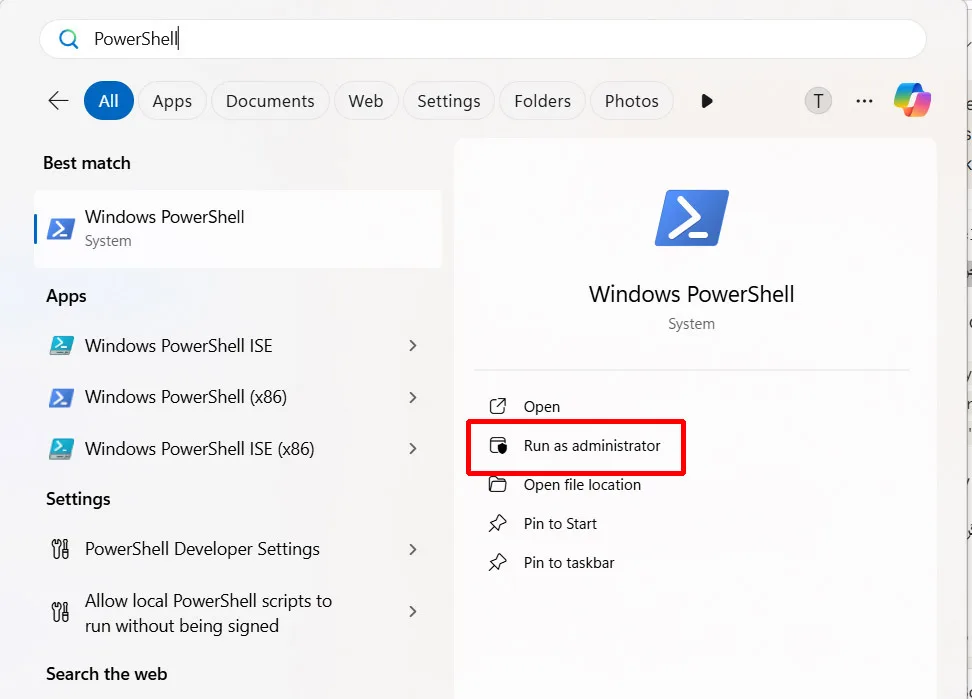 - در منوی استارت ویندوز عبارت PowerShell را جستجو کنید.