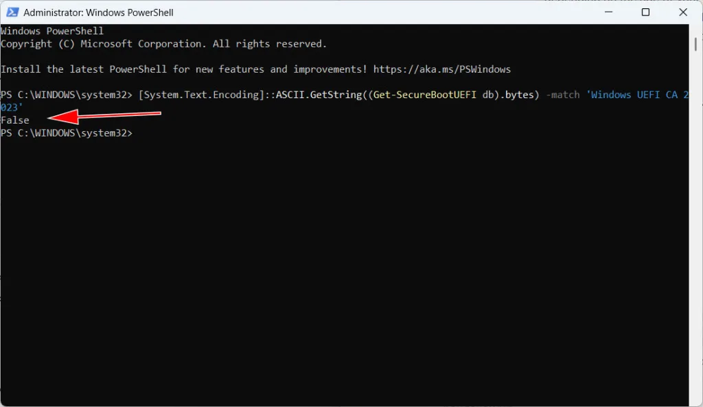 [System.Text.Encoding]::ASCII.GetString((Get-SecureBootUEFI db).bytes) -match ‘Windows UEFI CA 2023’