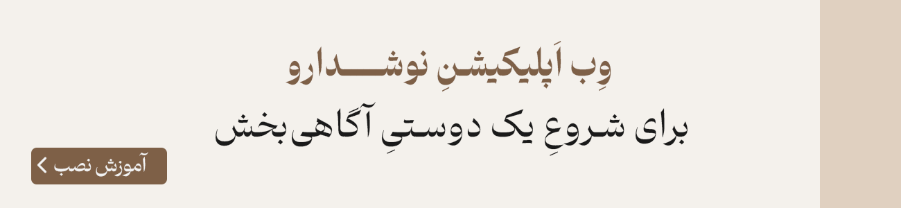 بنر نصب وب اپ نوشدارو با لوگوی نوشدارو در سمت راست تصویر و متنی که کاربران را به نصب وب اپ دعوت می‌کند