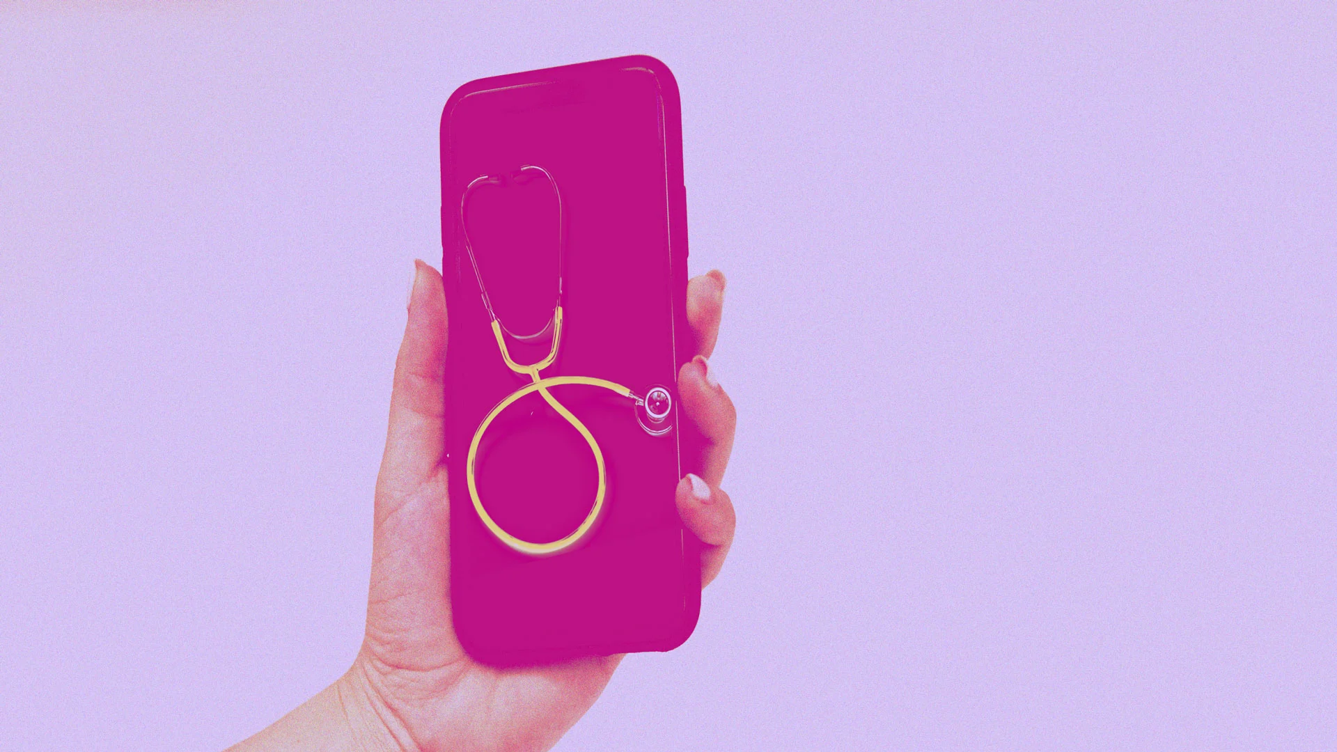 تصویری نمادین از یک دست که تلفن هوشمند صورتی رنگ را در دست گرفته و روی صفحه نمایش آن، صدای یک گوشی پزشکی قرار دارد که نشان‌دهنده جمع‌آوری و تحلیل اطلاعات زیستی بدن از طریق فناوری‌های دیجیتال و خطرات مرتبط با حریم خصوصی است.