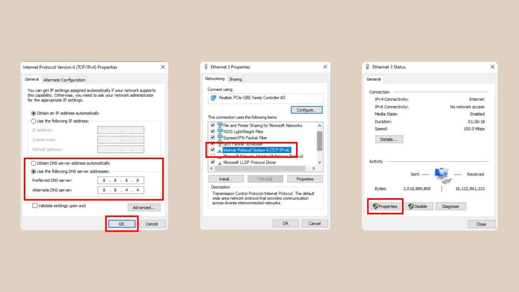 وقتی دارید DNS را روی کامپیوتر تغییر میدهید، دو گزینه میبینید: IPv4 و IPv6. اگر دقت کرده باشید، ما صرفاً گفتیم که IPv4 را تغییر دهید و کاری به گزینه دوم نداشتیم. IPv4 و IPv6 مثل خیابانهای اینترنتی میمانند. IPv4 حاوی پلاکهای قدیمی و کوتاه است و IPv6 پلاکهای جدیدتر و بسیار طولانیتر را در بر میگیرد.