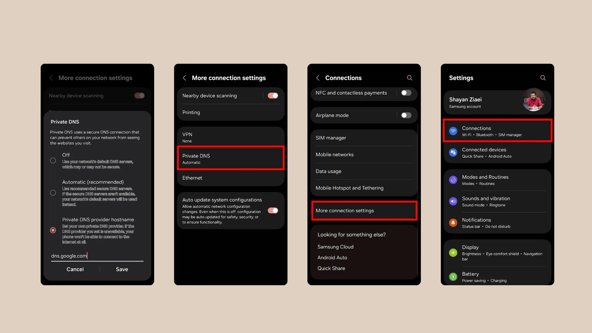 - دکمه More Connection Settings (در بعضی گوشیها Advanced) و بعد Private DNS را فشار دهید؛