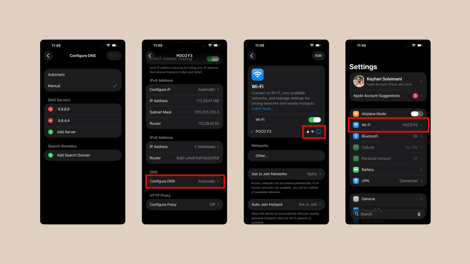 در نظر داشته باشید که این تنظیمات روی شبکه وایفای کنونی اعمال میشوند. بنابراین اگر به یک وایفای دیگر در کافه یا منزل دوستان وصل شوید، پیکربندی DNS را باید دوباره از اول انجام دهید.