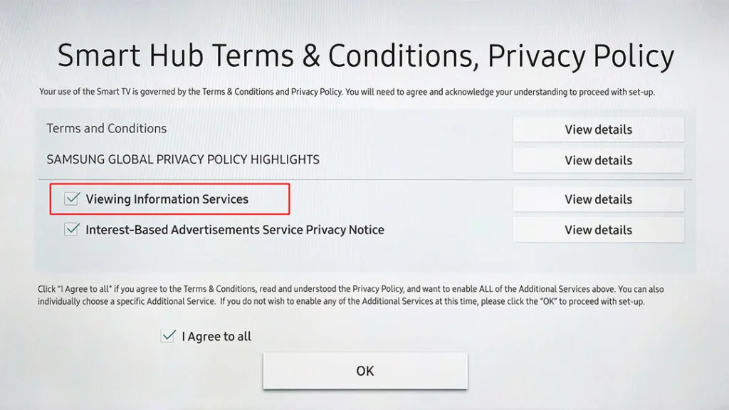 | سامسونگ | به دنبال گزینهای با نام Viewing Information Services بگردید و آن را غیرفعال کنید |