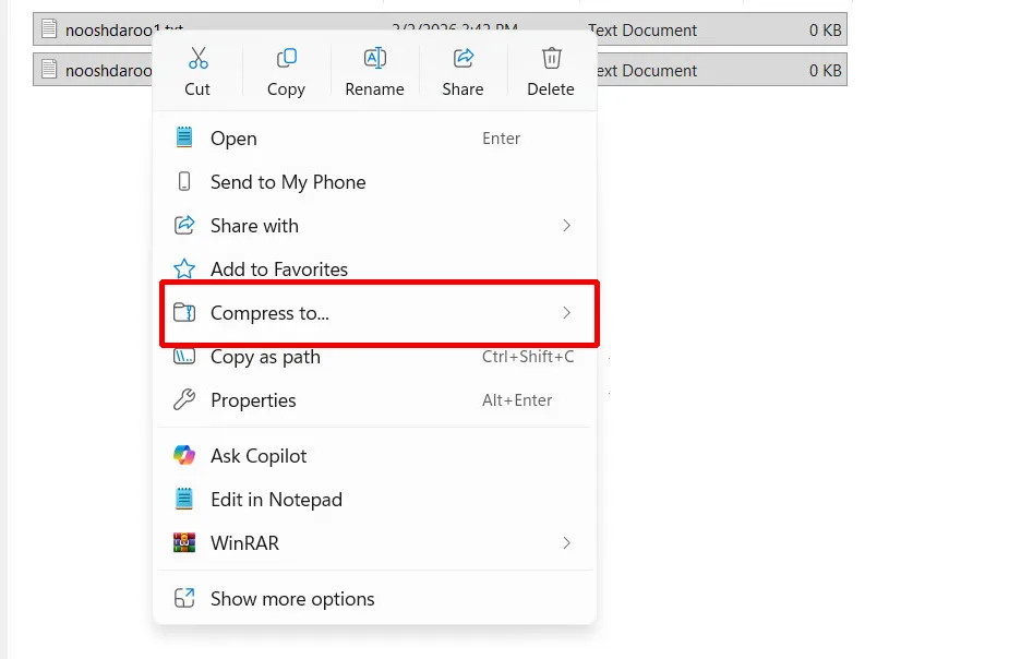 - روی فایل راستکلیک کنید و Compress to را بزنید.