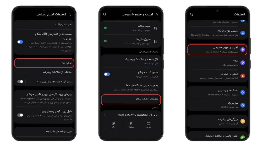نکات امنیتی تکمیلی: Secure Folde محیطی ایزوله ایجاد میکند، اما اگر شخص دیگری رمز صفحه قفل اصلی گوشی را بداند، در صورتی که Secure Folder مدت کوتاهی قبل باز شده باشد و قفل خودکار نداشته باشد، ممکن است به اطلاعات داخل آن دسترسی پیدا کند. برای امنیت حداکثری، تنظیمات Auto Lock را بهگونهای انتخاب کنید که بلافاصله پس از خروج یا خاموش شدن صفحه، Secure Folder قفل شود.