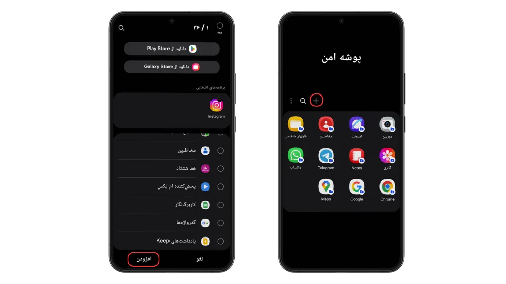 - داخل Secure Folder، روی آیکون + بزنید؛