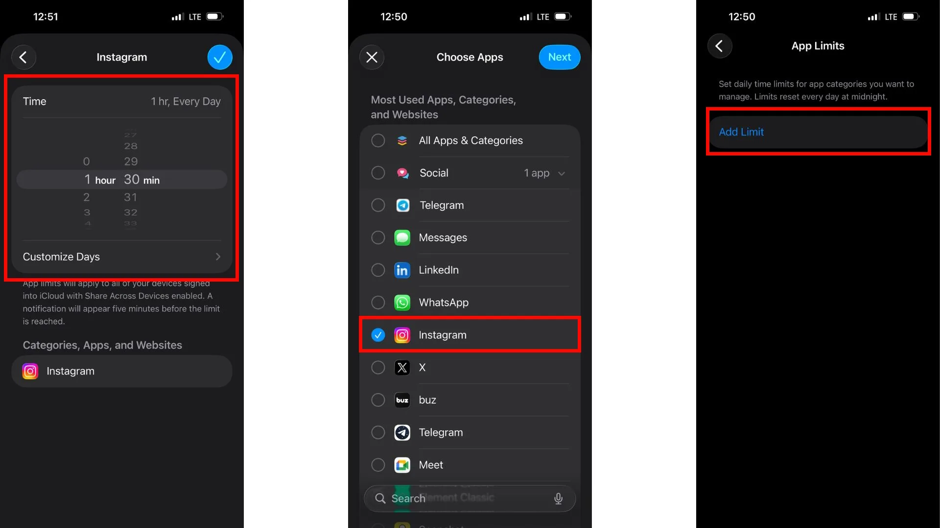 این روش بر پایهی App Limits کار میکند؛ یعنی روی اپها محدودیت زمانی میگذاریم و بعد از رسیدن به سقف زمانی، دسترسی دوباره فقط با وارد کردن رمز Screen Time امکانپذیر میشود.