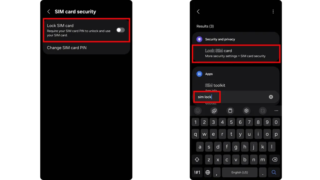 - دکمه Lock SIM Card را روشن کنید، رمز پیشفرض (که احتمالاً ۱۲۳۴ یا ۰۰۰۰ است) را وارد کنید و سپس رمز جدید مورد نظرتان را بنویسید.