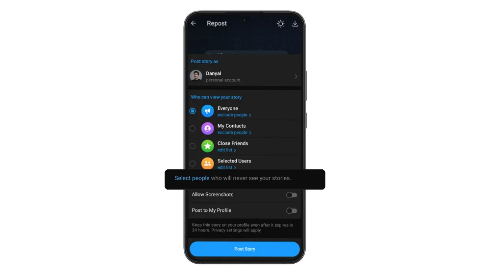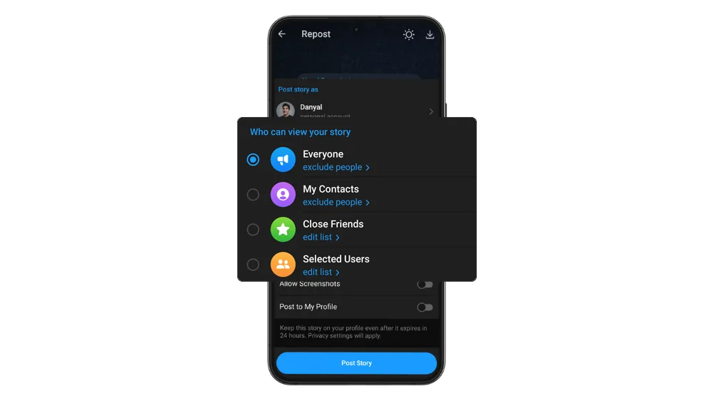 مهم‌ترین نکته، انتخاب دستی افرادی است که می‌توانند استوری‌ها را مشاهده کنند. توصیه می‌شود به جای گزینه «Everyone»، از گزینه «My Contacts» (مخاطبین من) یا «Close Friends» (دوستان نزدیک) استفاده کنید.