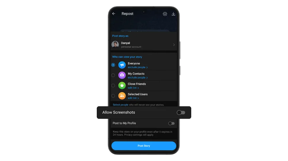 برای اطمینان خاطر هرچه بیشتر، تلگرام یک قابلیت جذاب دیگر نیز اضافه کرده: با غیرفعال داشتن گزینه Allow Screenshots، دیگران نمی‌توانند از استوری شما اسکرین‌شات بگیرند یا محتوای روی صفحه را ضبط کنند.